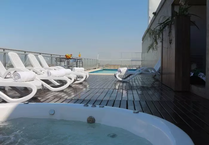 Rakennuksen katolla on pieni lämmitetty uima-allas ja jacuzzi, jossa kelpaa rentoutua, siemailla kylmää juomaa ja nauttia upeista näköaloista kaupungin yli.