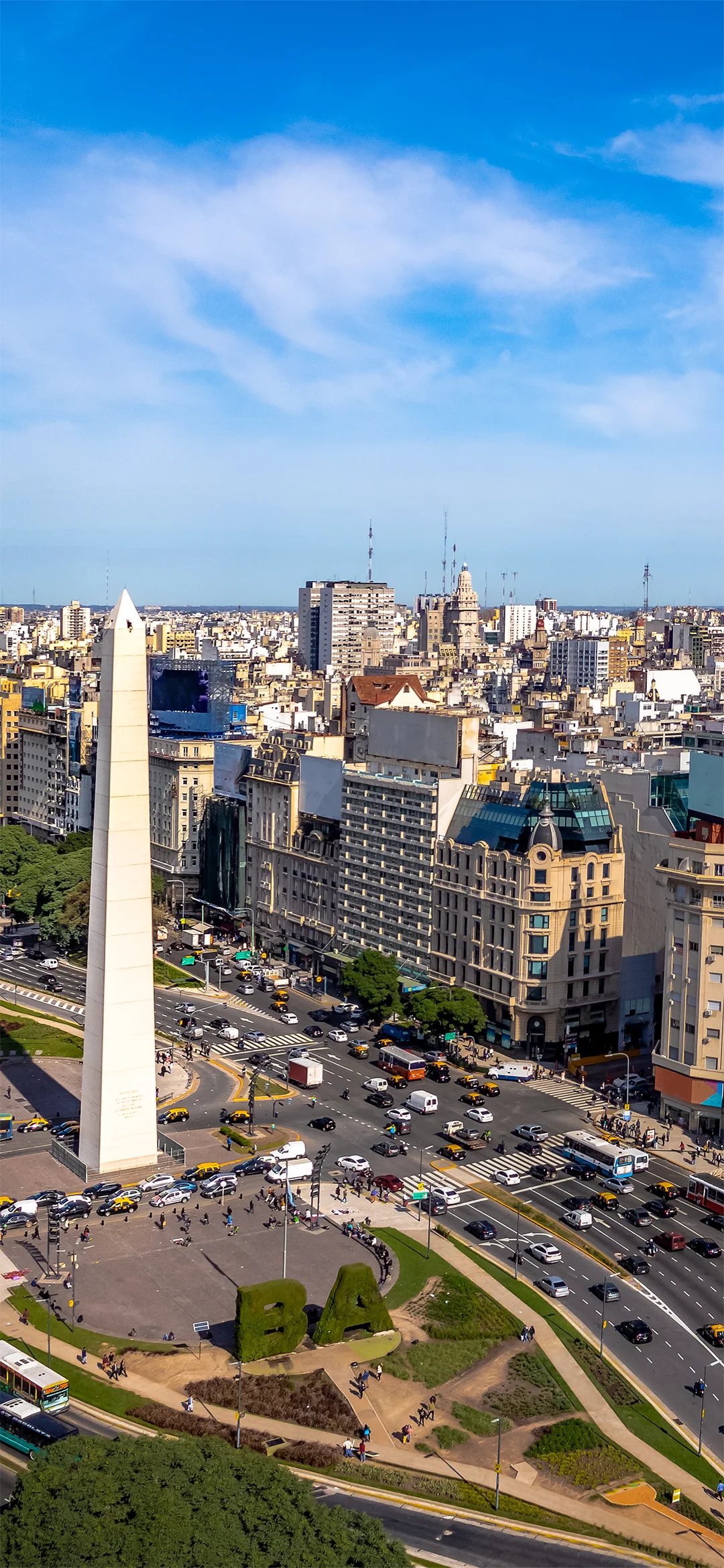 Seuraavaksi suunnataan Avenida 9 de Juliolle, joka on maailman levein bulevardi. Leveän kadun keskellä kohoava Obelisco on kaupungin tunnetuin maamerkki. Obeliskin kohdalla kulkeva poikkikatu Avenida Corrientes on toinen kaupungin merkittävimmistä valtaväylistä, jonka varrella sijaitsevat kaupungin teatterit, elokuvateatterit ja upea oopperatalo Teatro Colón.