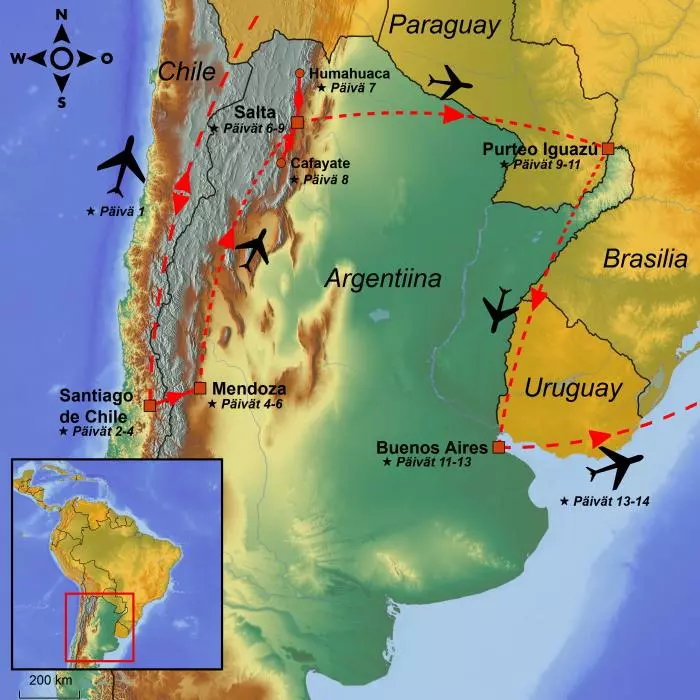 Tutustu Chilen ja Argentiinan kiehtoviin pääkaupunkeihin, näe majesteettiset Andit, vaikutu maisemista Iguassun putouksilla ja maistele Argentiinan parhaita viinejä Mendozassa ja Saltassa.