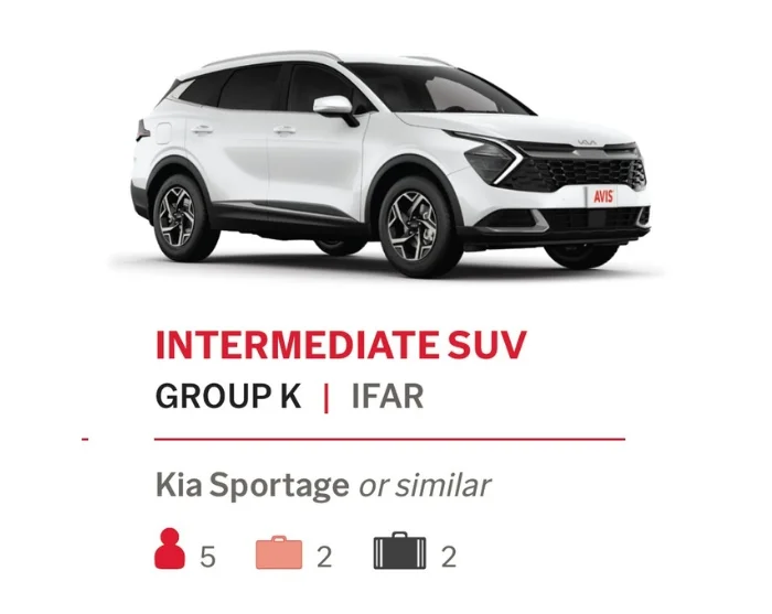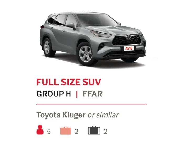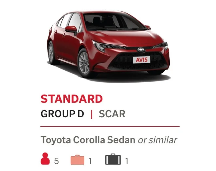 Käytämme Australiassa AVIS-autovuokraamoa. Matkaan sisältyy vakiona luokan D – ”standard” Toyota Corolla Sedan tai vastaava, joka sopii 1–3 henkilölle matkatavaroineen. Vuokra-autoa on mahdollista korottaa muihin luokkiin ja malleihin, jos matkustat isommalla porukalla tai haluat muuten vain isomman vuokra-auton.