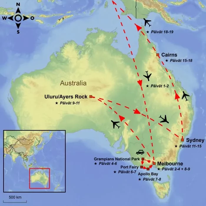 Lähde omatoimiselle autolomalle Great Ocean Roadille, joka on yksi maailman kauneimmista rannikkoreiteistä. Koe maan suurimmat kaupungit Melbourne ja Sydney, näe punaisen aavikon keskellä kohoava Uluru ja rentoudu lopuksi trooppisissa puitteissa Cairnissa.