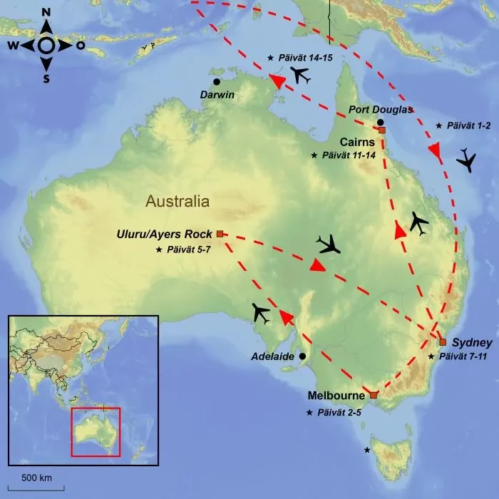 Koe Australian kiehtovimmat kontrastit. Matkusta maan kahdesta suurimmasta kaupungista – Melbournesta ja Sydneystä – punaisen aavikon keskellä kohoavalle Ulurulle. Vietä matkan viimeiset päivät trooppisessa Cairnsissa ja näe Iso valliriutta tai maailman vanhin sademetsä.