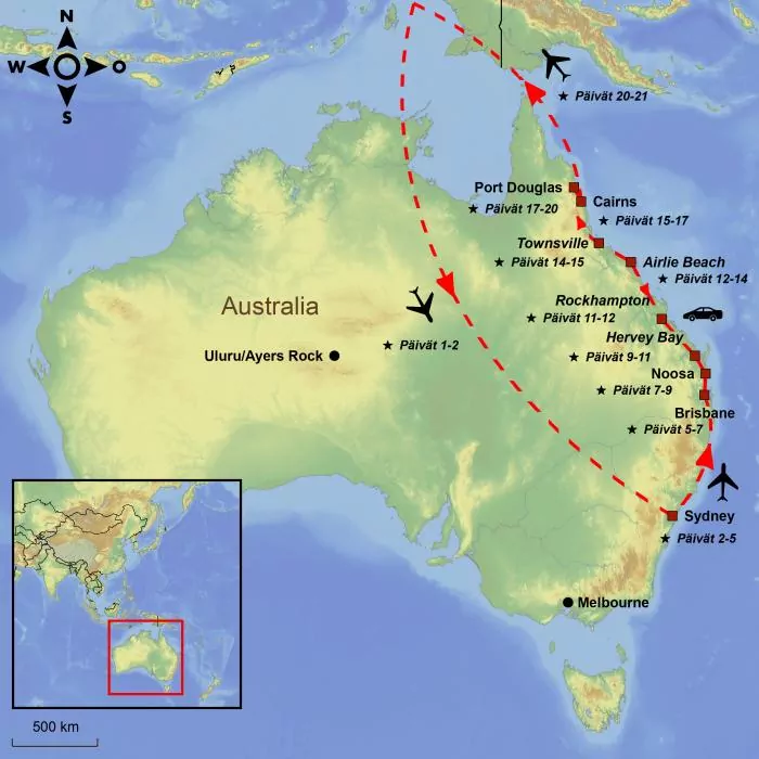Näet muun muassa maailman suurimman hiekkasaaren K’garin, entisen Fraser Islandin, joka tekee vaikutuksen kristallinkirkkailla makeavetisillä järvillään, rehevillä sademetsillään ja loputtomilla valkoisilla hiekkarannoillaan. Käyt veneretkellä Whitsunday Islandsin kansallispuistossa ja Whitehaven Beachilla, joka on yksi maailman kauneimmista rannoista. Luonnollisesti poikkeat myös Cairnsissa, josta lähtee retki Great Barrier Reefille eli Isolle valliriutalle, maailman suurimmalle koralliriutalle.
