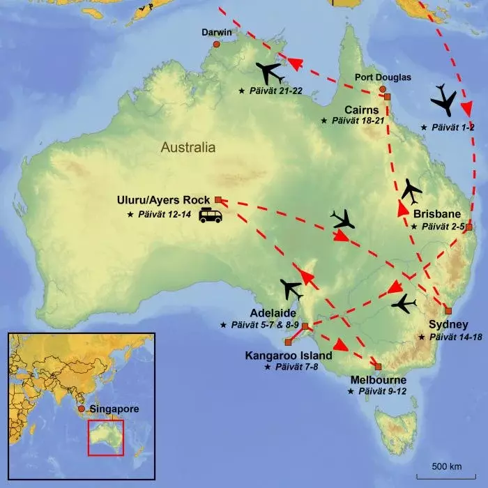 Tänään on aika jättää Outback taakse, sillä seuraava pysäkki on Australian suurin kaupunki Sydney! Siirryt ensin hotelliltasi lentokentälle ilmaisella bussikuljetuksella. Bussien lähtöajat suunnitellaan lentojen mukaisesti, joten tarkista hotellin vastaanotosta, milloin sinulle sopiva bussi on lähdössä.