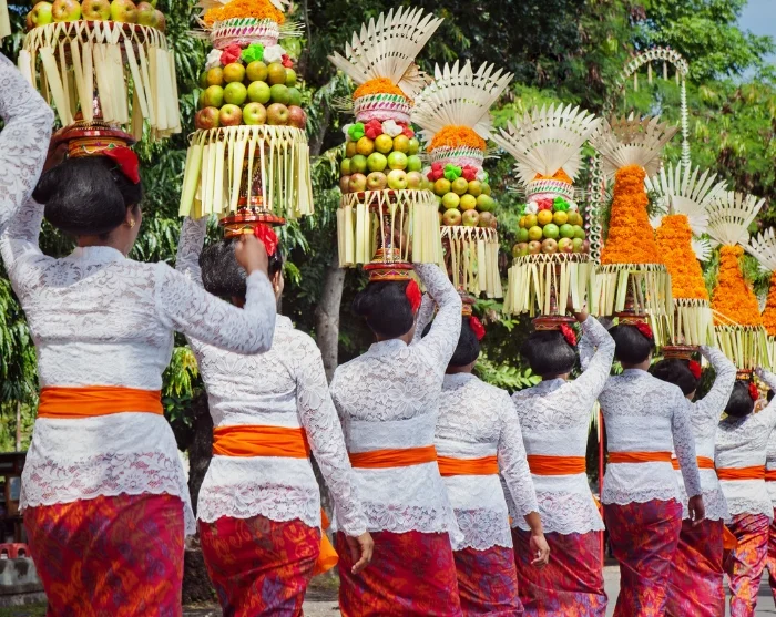 Temppeleissä ja kaduilla järjestetään usein seremoniallisia kulkueita, jotka voivat olla todella hauska ja mukaansatempaava elämys. Jalkakäytävien varsilla näkyy pieniä banaaninlehdistä punottuja koreja, joiden sisältämät uhrilahjat ja suitsukkeet suojaavat pahoilta hengiltä.