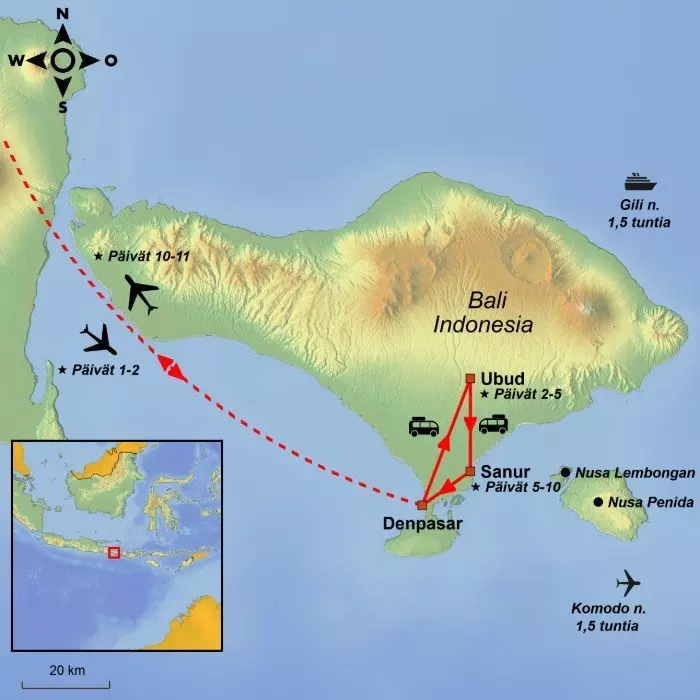 Matka alkaa kiehtovasta Ubudin taiteilijakaupungista, joka sijaitsee Balin kauniilla ylänköseudulla vehreiden riisiterassien, jokien ja pyhien temppelien ympäröimällä paikalla. Ubud on myös Balin kulttuurikeskus, jonka asukkaat nauttivat täysin sydämin värikkäistä perinteistä ja seremoniallisista kulkueista. Päivät ovat vapaita, joten voit valita itse, kuinka monelle jännittävälle lisäretkelle haluat osallistua.