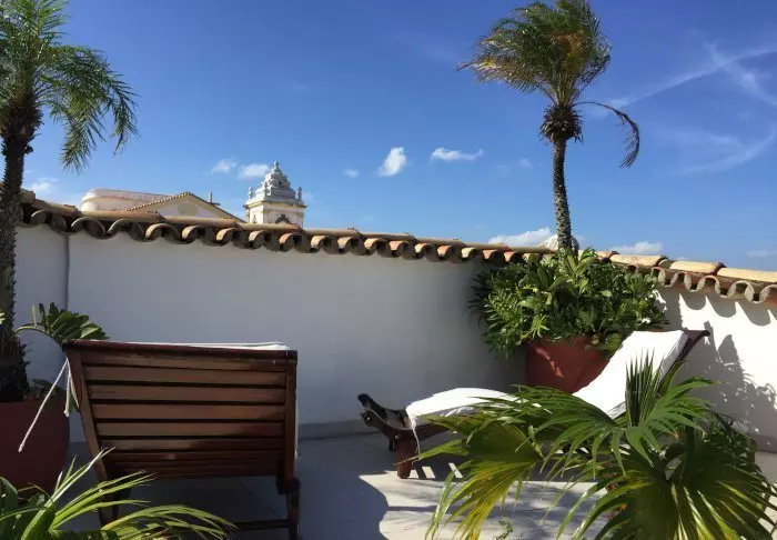 Pienellä kattoterassilla on mukava rentoutua ja nauttia kupillinen kahvia auringon laskiessa kaupungin kattojen ylle.