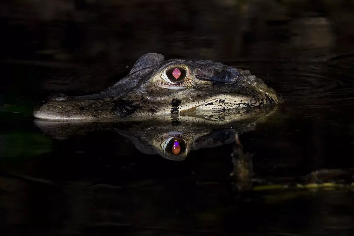 Pimeän laskeuduttua lähdetään vesille etsimään kaimaaneja. Oppaan taskulampun keila viistää vettä. Kun valo osuu kaimaanin silmiin, ne hehkuvat pimeässä ja paljastavat eläimen sijainnin. Kaimanit elävät Etelä- ja Keski-Amerikassa, ja ne kuuluvat krokotiilien ja alligaattorien sukuun.