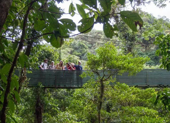 Ensimmäisenä on vuorossa noin 2,5 km kävelyretki korkealla puunlatvojen lomassa puiden väliin rakennetuilla korkeilla kävelysilloilla. Satumaisessa metsämaisemassa vallitsee ainutlaatuinen, lähes maaginen tunnelma, jonka voit kokea parhaiten yläilmoista käsin. Metsäluonnolle ovat ominaisia jylhät puut, orkideat, saniaiset ja sammalet, ja kaikkialla kuuluu värikkäiden pikkulintujen, kuten mayaketsaalien ja kuparitaskukolibrien sirkutus. Monteverden alueella elää yli 400 eri lintulajia, joten metsä on todellinen lintubongarin paratiisi.