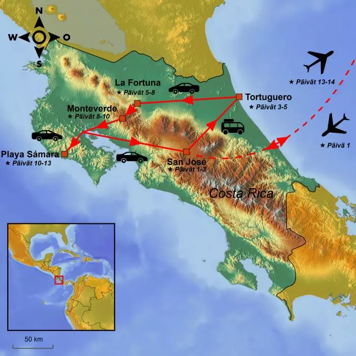 Lähde autolomalle Costa Rican satumaisiin maisemiin ja koe Tortugueron kansallispuisto, legendaarinen Arenal-tulivuori, Monteverden mystinen pilvimetsä ja Playa Sámaran idylliset hiekkarannat.