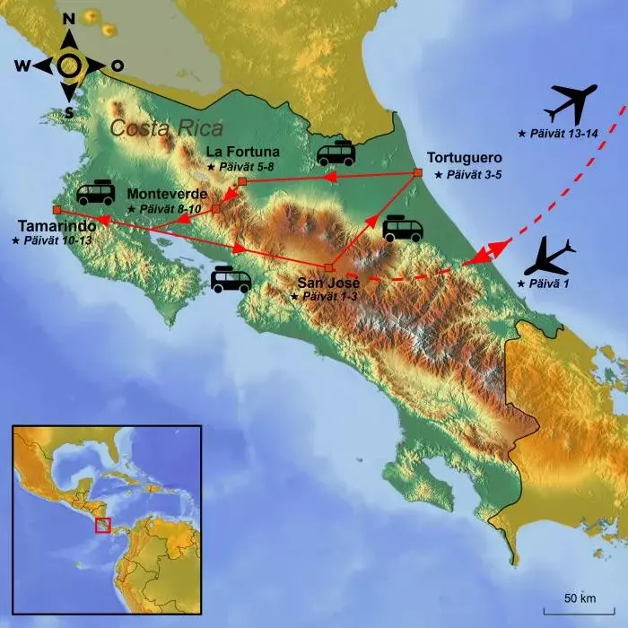 Koe Costa Rican upea luonto ja rikas eläinmaailma: Tortugueron kansallispuiston vehreiltä kanavilta Arenal-tulivuoren dramaattisiin maisemiin ja Monteverden satumaiseen pilvimetsään. Matka huipentuu rentoutumiseen Tamarindon kultaisella hiekkarannalla.