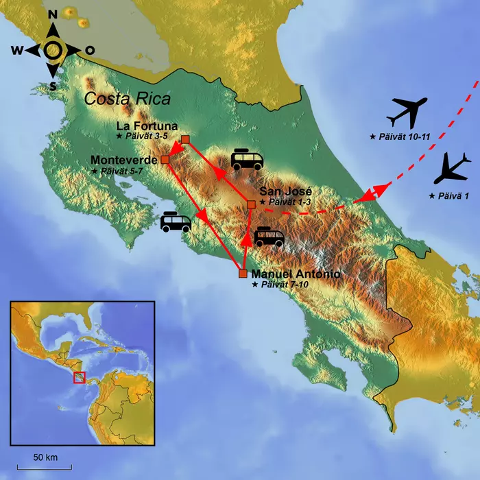 Tämä matka tarjoaa hyvän maistiaisen Costa Rican ainutlaatuisesta luonnosta, kiehtovasta eläimistöstä ja vieraanvaraisista paikallisista, jotka kutsuvat itseään ”ticoiksi”. Vapaata aikaa on runsaasti, joten voit tutustua kyliin ja kaupunkeihin omassa tahdissasi tai varata erilaisia lisäretkiä silloin, kun muuta suunniteltua ohjelmaa ei ole.