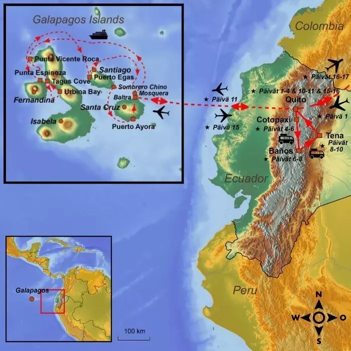 Huomaa, että Galápagossaarilla päiväohjelma voi muuttua milloin tahansa. Sääolosuhteet ja paikallisten viranomaisten määräykset voivat johtaa reitin muuttumiseen lyhyelläkin varoitusajalla.