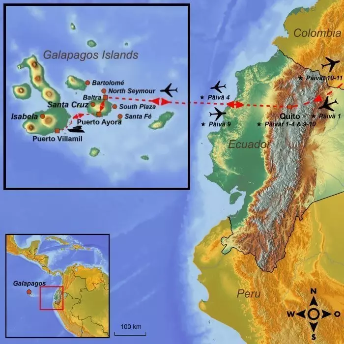 Saapuessasi Baltra-lentokentälle sinun tulee maksaa pääsymaksu Galápagokselle (käteisellä). Oppaasi on vastassa lentokentän ulkopuolella, ja matkustat hänen kanssaan bussilla Itabaca-kanavalle. Täältä matka jatkuu lautalla pääsaarelle, jonka nimi on Santa Cruz.