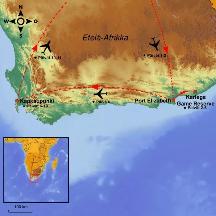 Matka alkaa lennolla Suomesta Port Elizabethiin välilaskun/-laskujen kautta.