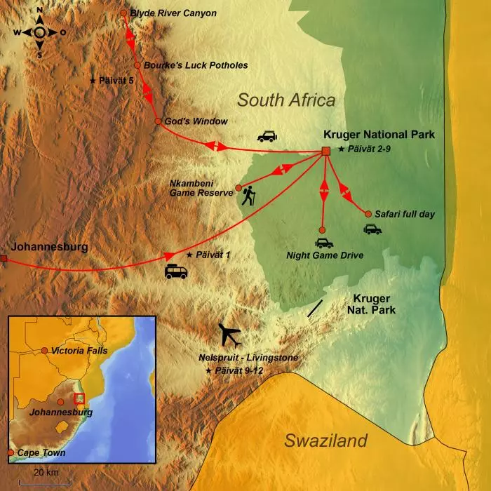 Nauti Etelä-Afrikan kauniista luonnosta safarilla Krugerissa ja majoitu lodgessa, joka sijaitsee vain kivenheiton päässä Krugerin kansallispuistosta. Matka huipentuu vierailuun mahtavilla Victorian putouksilla.