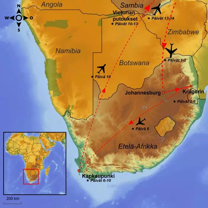 Matkustatko ensimmäistä kertaa eteläiseen Afrikkaan? Tämä matka tarjoaa sekä safarielämyksiä että suurkaupungin sykettä Kapkaupungissa. Kierros huipentuu mahtavien Victorian putousten pärskeisiin.