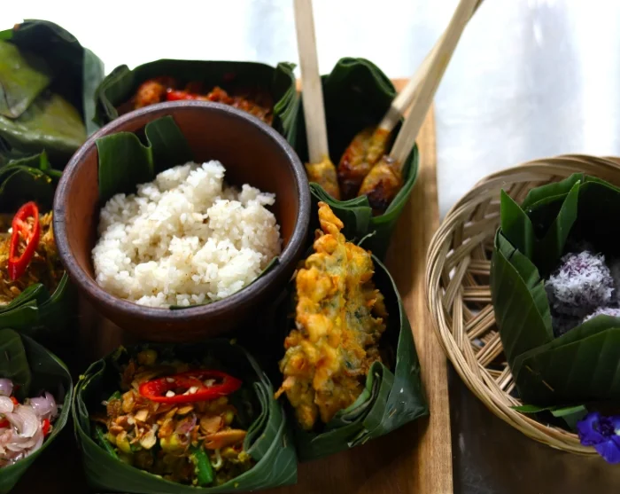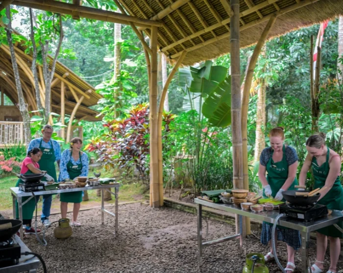Kyläkierroksen jälkeen palaat Kauraan, jossa päivä jatkuu resortin avokeittiössä yhdessä kylän lämpimien ja ystävällisten naisten kanssa. Täällä opit valmistamaan klassisia balilaisia annoksia tuoreista, paikallisista raaka-aineista, samalla kun isäntäväki jakaa reseptejään ja kertoo ruoan merkityksestä kyläyhteisössä. Tutustut sukupolvelta toiselle siirtyneisiin tekniikkoihin ja makuihin sekä koet yhteisen ruoanlaiton tuoman ilon ja ylpeyden.