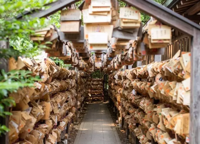 Vierailet myös Hikawan pyhäkössä, joka on perustettu vuonna 541. Pyhäkkö on omistettu viidelle jumalalle, joista kaksi paria on naimisissa. Siksi Hikawa on erittäin suosittu nuorten japanilaisten pariskuntien ja avioparien keskuudessa, jotka tulevat pyhäkköön rukoilemaan rakkauden, parisuhteensa tai avioliittonsa puolesta. Kävelet pyhäkön 15 metriä korkean torii-portin läpi käytävään, jossa roikkuu lukemattomia pieniä puisia tauluja. Näihin niin kutsuttuihin ema-tauluihin kävijät ovat kirjoittaneet toiveitaan. Kesäaikaan pyhäkön tuulikellot soittavat kaunista musiikkiaan.