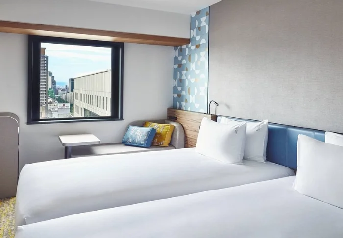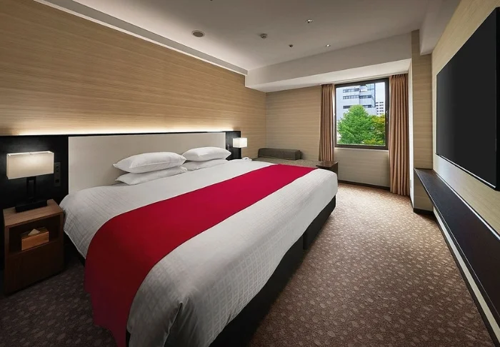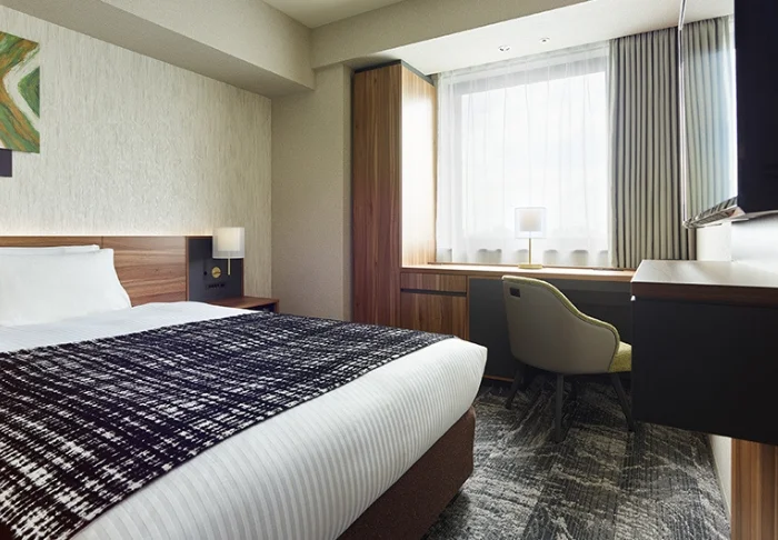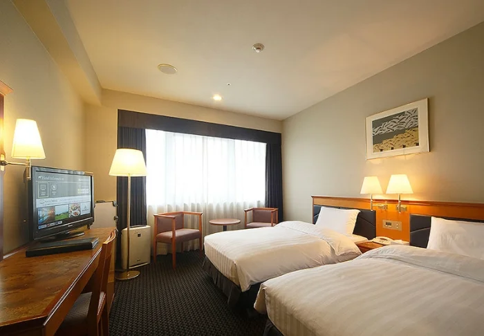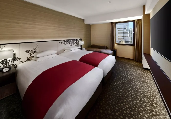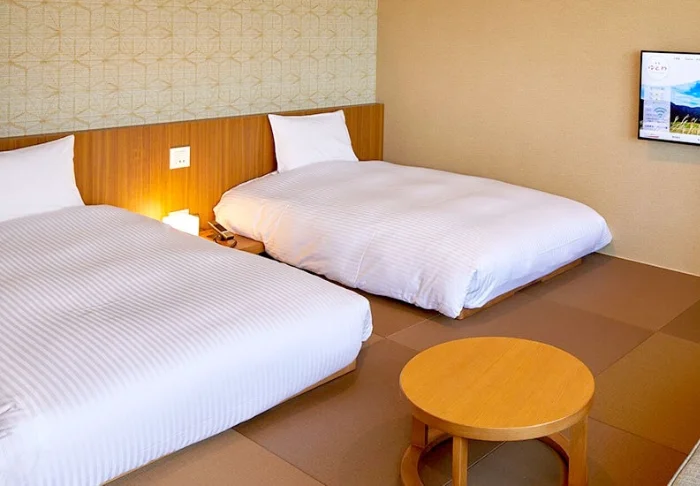 Hotellin tilavat huoneet on sisustettu japanilais-länsimaiseen tyyliin. Isoista ikkunoista tulvii valoa, ja mukavassa sängyssä nukut hyvin pitkän seikkailupäivän jälkeen. Huoneissa on ilmastointi, Wi-Fi, minijääkaappi, tallelokero ja vedenkeitin, ja kylpyhuoneesta löytyy hiustenkuivaaja ja kylpytuotteita.
