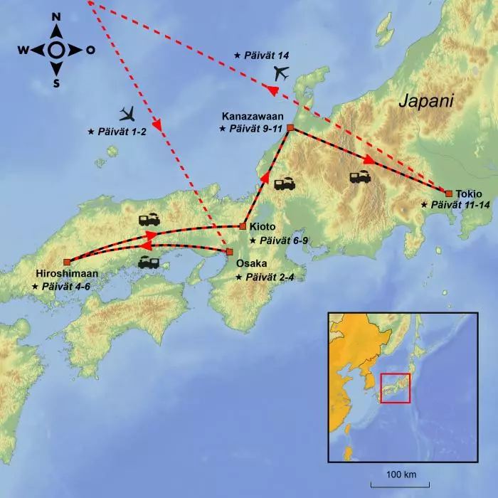 Tämä matka alkaa Osakasta, jota pidetään Japanin ruokakulttuurin kehtona. Osakasta matka jatkuu Hiroshimaan, jossa vierailet Rauhanpuistossa katsomassa ikonista Atomikupolia. Japanin sydän löytyy sen vanhasta pääkaupungista Kiotosta ja samuraiden valtakeskuksesta Kanazawasta, jossa koet historiallisen Japanin perinteisten puutalojen ja pyhäkköjen, mukulakivikatujen, geishojen ja kimonopukuisten turistien keskellä. Tokiossa palaat nykyaikaan – ja otat muutaman askeleen kohti tulevaisuutta. Tokio on Japanin nykyinen pääkaupunki, ja sitä pidetään Japanin aivoina. Täällä kaikki on ultramodernia ja trendikästä. Maisemaa hallitsevat pilvenpiirtäjät, ja matkailijaa ihastuttavat huipputehokkaat liikennejärjestelyt. Eri kohteiden väliset matkat taittuvat Shinkansen-luotijunalla tai tavallisella pikajunalla. Japanin tehokkaan rautatieverkoston ja huippunopeiden suurnopeusjunien kokeminen on kohokohta jo itsessäänkin.