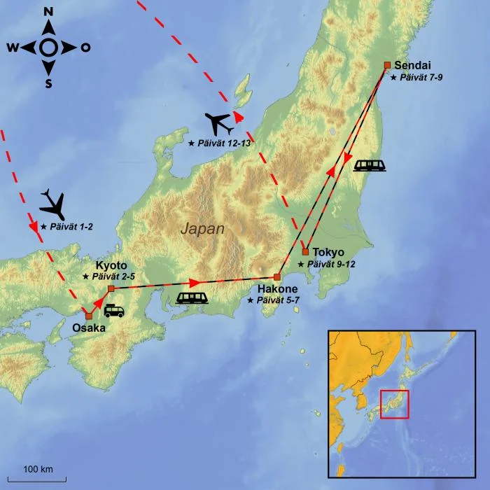Ikonisesta Hakonesta matka jatkuu pohjoiseen Sendaihin, jossa pääset tutustumaan Japanin paikallisempaan ja vähemmän vierailtuun osaan. Vierailet Yamaderassa, vuorten suojassa sijaitsevalla temppelialueella, jonne noustaan kivisiä portaita pitkin setrimetsän halki. Reitin varrella kohoavat temppelit asettuvat rinteille ja kallioiden lomaan. Ylhäältä avautuvat näkymät laaksoon ja ympäröiville vuorille, ja tunnelma on rauhallinen ja seesteinen.