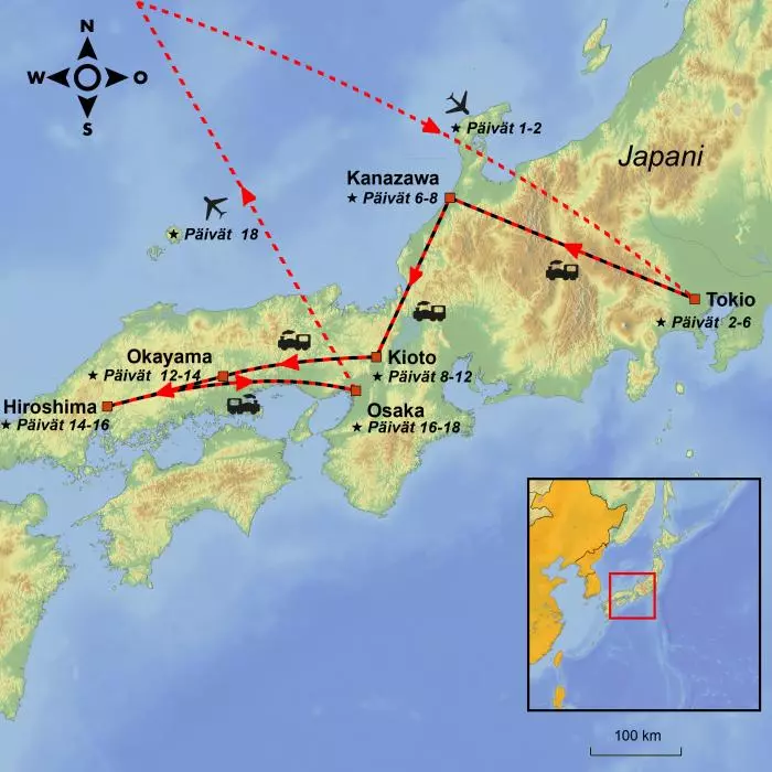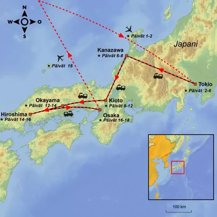 Japanin parhaat -kiertomatka tarjoaa niin tunnetuimpia nähtävyyksiä kuin tuntemattomampia helmiä. Reitti vie Tokiosta Kanazawaan, Kagaan, Kiotoon, Okayamaan, Hiroshimaan ja Osakaan, ja 18 päivän aikana pääset sukeltamaan syvälle Japanin historiaan, kulttuuriin ja nykyaikaan. Näet niin pilvenpiirtäjiä ja modernia arkkitehtuuria kuin vanhoja kulttuurikaupunkeja ja kauniita puulinnoja. Vierailet elävät geisha-korttelit ja vaikuttavalla Atomikupolilla. Tutustut zen-kulttuuriin japanilaisissa puutarhoissa.