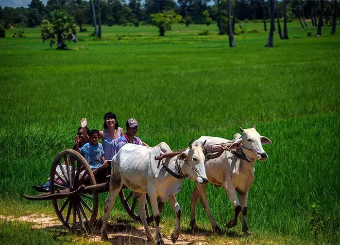 Matka jatkuu pieneen Chansarin kylään, jossa siirrytään veneestä härkävaunuihin. Härkäkyydissä kuljetaan pitkin kuoppaista mutta hauskaa tietä peltojen läpi aina paikallisen khmer-perheen kotiin. Perhe tienaa elantonsa myymällä luutia, joiden valmistusta pääset seuraamaan ja halutessasi myös kokeilemaan.