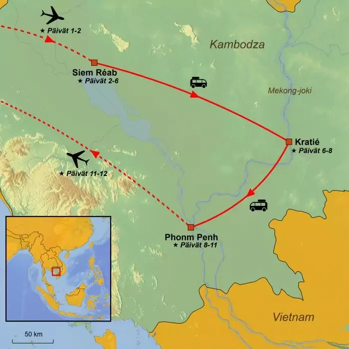 Tällä matkalla pääset kokemaan kaupungin ja maaseudun väliset kontrastit, ihastelemaan siirtomaa-ajan viehättäviä ranskalaisia huviloita, seikkailemaan kaupunkien varjoisilla kujilla ja tutustumaan maan rikkaaseen buddhalaiseen kulttuuriin temppeleineen ja pagodeineen. Kaiken yhdistävinä voimina toimivat vehreä luonto ja vieraanvaraiset kambodzalaiset, joista suurin osa kuuluu khmerien etniseen ryhmään.