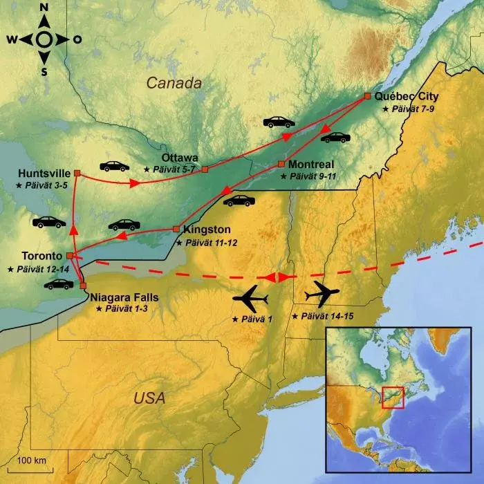 Jos haaveilet Itä-Kanadan klassisista luontokohteista ja kaupungeista, tämä klassinen autoloma on erinomainen valinta. Tällä matkalla pääset tutustumaan Itä-Kanadan kulttuuriin, luontoon ja historiaan aina majesteettisista Niagaran putouksista hurmaavaan Québeciin ja vilkkaisiin suurkaupunkeihin, kuten Torontoon ja Montrealiin.
