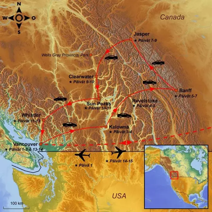 * Jos haluat noutaa vuokra-autosi vasta lähtiessäsi Vancouverista kiertomatkalle, kysy asiasta matka-asiantuntijaltasi.