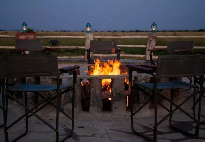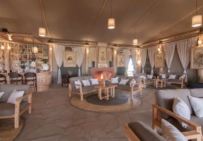 Leirissä on myös yhteisteltta, jonka mukavat nahkakalusteet kutsuvat rentoutumaan päivällisen jälkeen. Päivällinen puolestaan tarjoillaan joko avoimen taivaan alla tai ravintolateltassa.