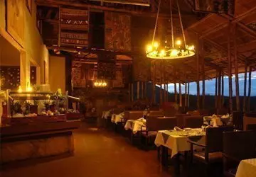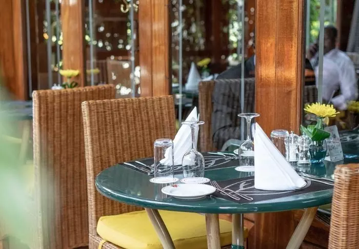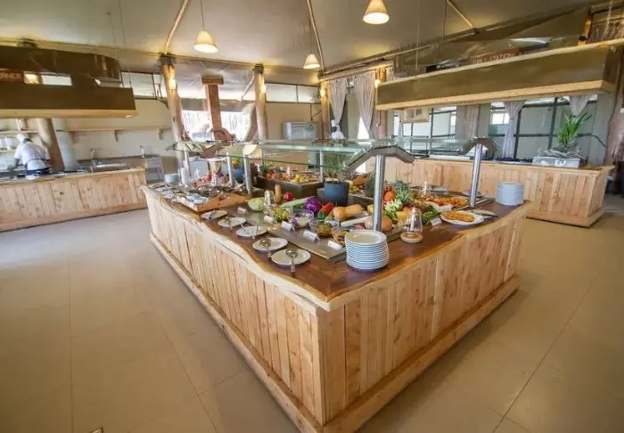 Ateriat tarjoillaan päärakennuksessa, jossa sijaitsevat myös vastaanotto ja viihtyisä baari. Valittuina iltoina baarissa on joskus live- musiikkia. Ravintolan edessä on suuri nurmikkoalue, jossa on penkkejä ja mukavia nurkkauksia, joista voi ihailla näkymää vesialtaalle. Ravintolan ja telttojen välissä on uima-allas, jota ympäröivät aurinkotuolit.