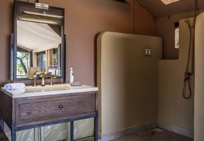 Mukavuudesta ei kuitenkaan tarvitse tinkiä! Kangasteltassa on runsaasti tilaa pöydälle, tuoleille ja pehmeälle sängylle, ja tila on sisustettu kauniisti luonnonväreillä, joten mikään ei ”pistä silmään”. Kaikissa teltoissa on luonnollisesti oma ”kylpyhuone” teltan takaosassa, ja suihkusta tulee lämmintä vettä. Telttoja on yhteensä 12, ja jokaiseen kuuluu oma viihtyisä terassi. josta aukeaa hieno näköala tasangoille.