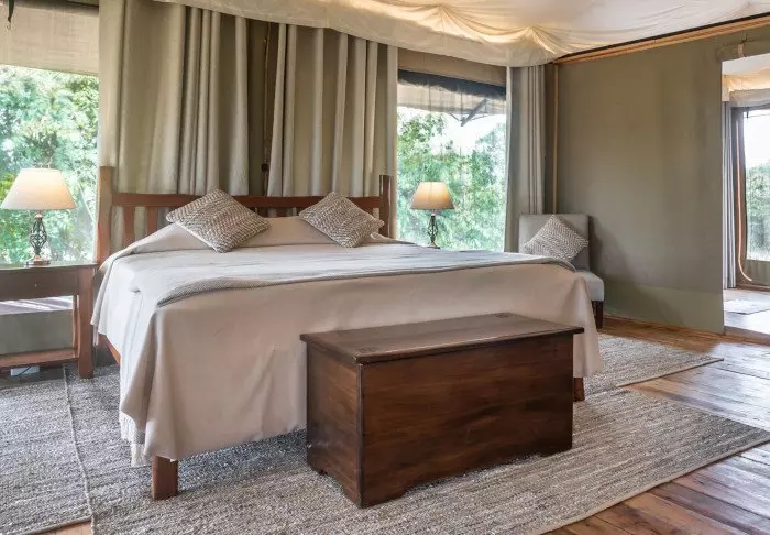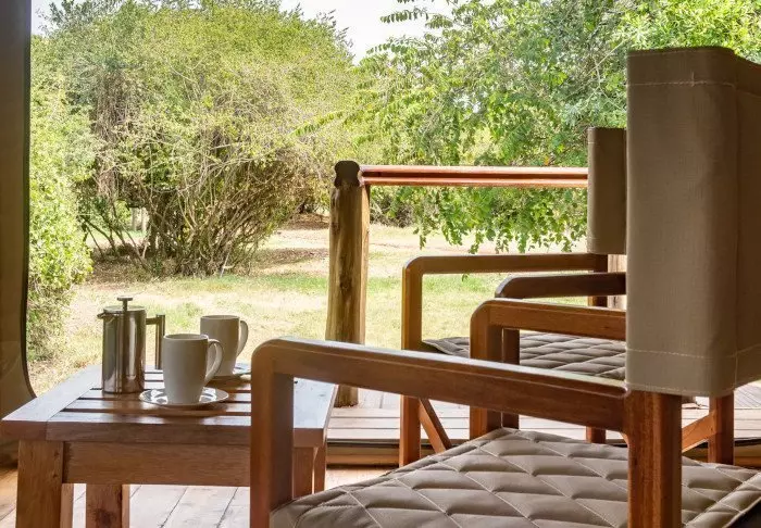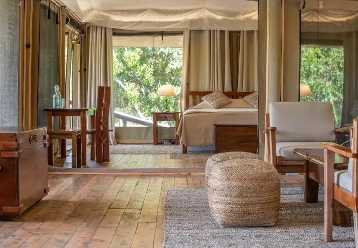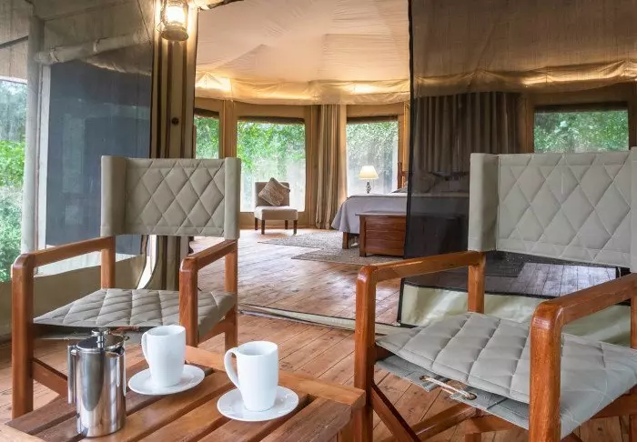 Messiteltassa on tarjolla hyvää ruokaa ja kiehtovia safaritarinoita. Myös messiteltan seinät ovat kangasta, ja kauniit kalusteet ja taidokkaasti valmistetut valaisimet luovat juuri sopivan ylellistä tunnelmaa.