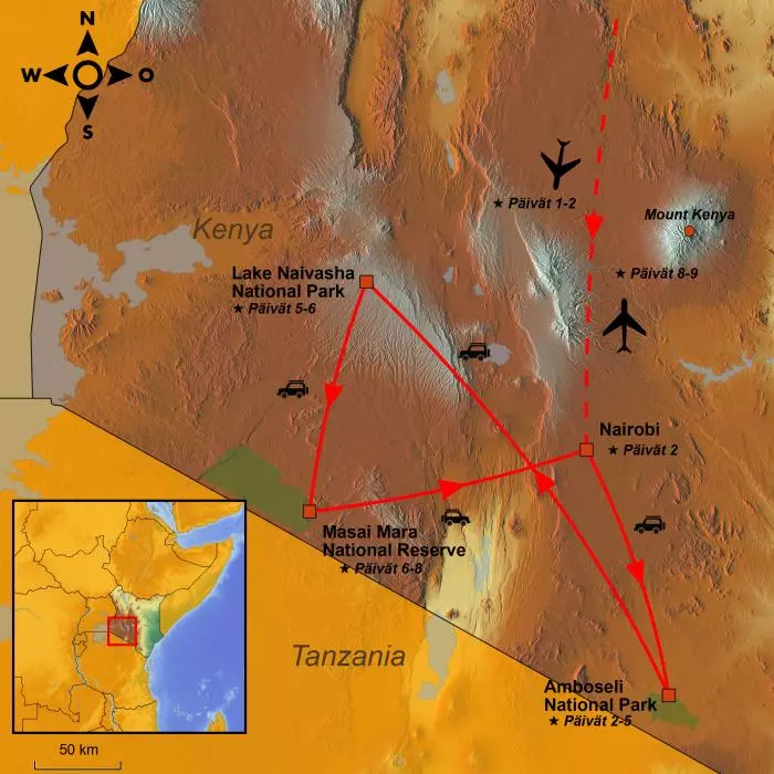 Koe klassinen Kenian-kiertomatka, jonka aikana näet kaikki maan tärkeimmät vetonaulat. Reitti kulkee Amboselin norsujen luota ihastelemaan Naivashajärven virtahepoja ja lopuksi Masai Maraan.