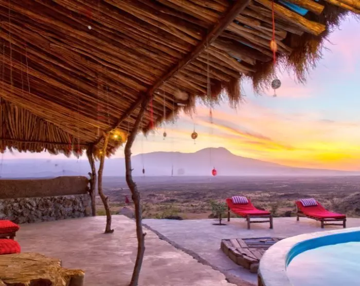 Majoittaudut mökkiisi, jossa vietät kaksi yötä. Nauti viileä juoma katsellen samalla auringonlaskun ja Kilimanjaron maisemia.