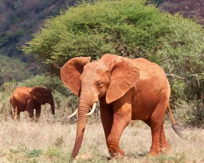 Itä-Tsavossa maaperä on kirkkaan punainen, mikä tekee eläimistä selvästi punertavan näköisiä. Se tekee vaikutuksen, kun näet punertavan norsun ensimmäistä kertaa! Maisema on tasainen, joten eläimet on helppo havaita.