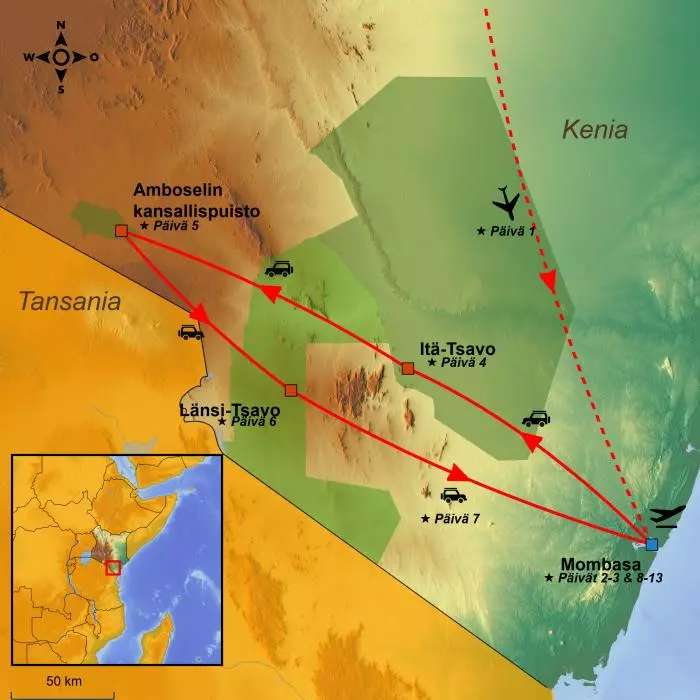 Tämä matka on rentouttavan rantaloman ja kolmeen kansallispuistoon suuntautuvan jännittävän safarin sekoitus. Matka alkaa Mombasasta, jonka valkeilla hiekkarannoilla voit rentoutua ennen safariseikkailun alkamista. Vietettyäsi Mombasassa kaksi yötä jatkat matkaa Itä-Tsavon kansallispuistoon, joka muodostaa osan yhdestä Kenian suurimmista ja vanhimmista kansallispuistoista. Täällä voit nähdä Afrikan legendaarisimpia villieläimiä sekä harvinaisia mustia servaaleja, kuduja ja keihäsantilooppeja. Amboselin kansallispuisto on yksi Kenian pienimmistä, ja sen maisemaa hallitsee majesteettinen lumihuippuinen Kilimanjaro. Puisto on erityisen tunnettu suurista norsulaumoistaan. Länsi-Tsavon maisema on uskomattoman monipuolinen ja vaihtelee kosteikoista ja luonnonlähteistä muinaisten tulivuorien jälkeensä jättämään mäkimaastoon. Täällä voit päästä lähelle pensassarvikuonoja, puhveleita, leijonia, leopardeja ja virtahepoja sekä nähdä savannin tomun punaisiksi värjäämiä norsulaumoja.