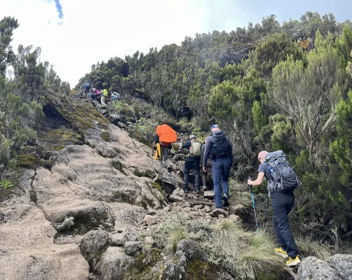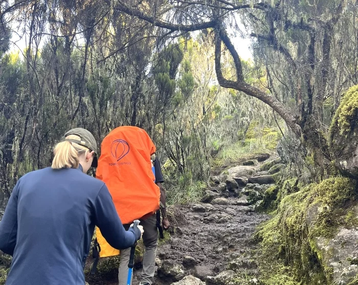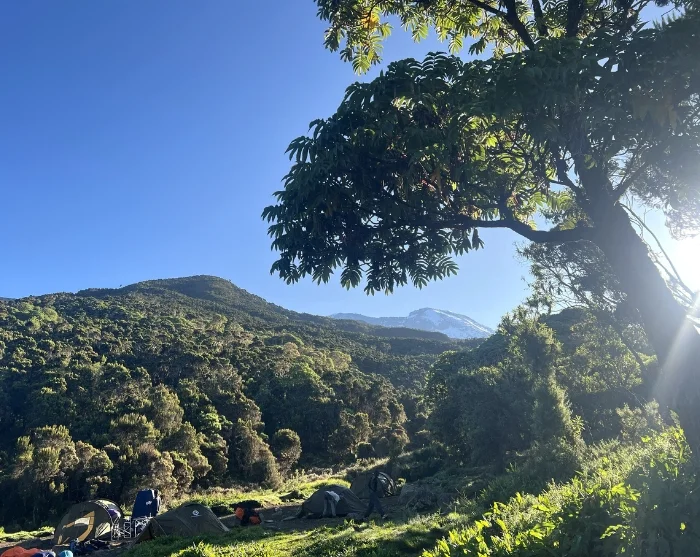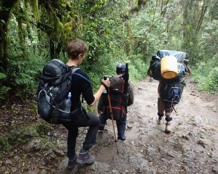 Nousun ensimmäinen osuus on matalammalla, joten olosuhteet voivat olla kosteat ja mutaiset. Vaellat kauniita polkuja pitkin tiheän sademetsän läpi, jossa voit hyvällä tuurilla saada vilauksen eläimistä, kuten kauniista ja harvinaisista mustavalkoisista gueretsoista. Kantajat kulkevat edeltä, jolloin teltat ja varusteet ovat jo paikallaan siinä vaiheessa, kun saavut Machame Campin leirille.