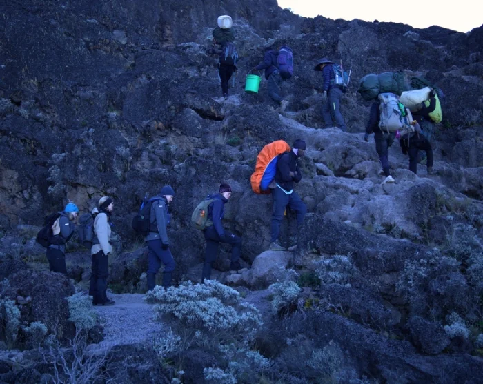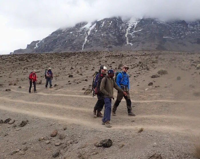 Vaikuttavan Great Barranco Wallin kupeessa vietetyn yön jälkeen nautitaan tukeva aamiainen ja lähdetään nousemaan tätä kuuluisaa jyrkännettä. Kaikeksi onneksi jylhän jyrkänteen kiipeäminen on helpompaa kuin miltä näyttää. Verhomaisen Heim-jäätikön alta Kilimanjaron henkeäsalpaava maisema avautuu koko komeudessaan.