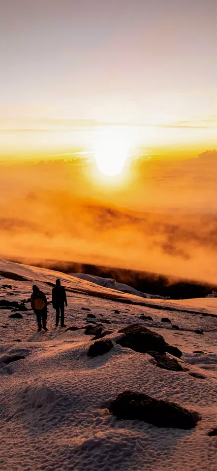 Kevyen välipalan jälkeen on edessä nousun viimeinen osuus ja Kilimanjaron huippu. Maasto on haastavaa ja poluilla on paljon irtokiviä, minkä vuoksi monet kokevat tämän koko nousun vaikeimmaksi osuudeksi. Tavoitteena on saavuttaa Gilman’s Point aamun sarastaessa, jolloin sinun pitäisi ehtiä Kibon korkeimmalle huipulle eli Uhurulle vähän auringonnousun jälkeen. Gilman’s Pointilla pidetään lyhyt levähdystauko ja nautitaan henkeäsalpaavista maisemista. Matka jatkuu kraatterinreunaa pitkin, ja viimeinen osuus aina Uhurulle asti on tasaisesti nousevaa maastoa. Matkalla Uhuru Peakille – Kilimanjaron ja koko Afrikan korkeimmalle kohdalle – voi vuodenajasta riippuen sataa lunta. Kun viimein saavutat 5895 metrin korkeudessa häämöttävän huipun, voit onnitella itseäsi, nauttia henkeäsalpaavista näköaloista ja ottaa selfien Uhuru Peak -kyltin kanssa muistoksi urakastasi.