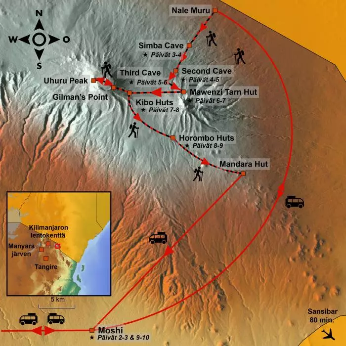 Korkeudet: Kibo Huts: 4 695 m mpy, Uhuru Peak: 5 895 m mpy, Horombo Huts: 3 690 m mpy