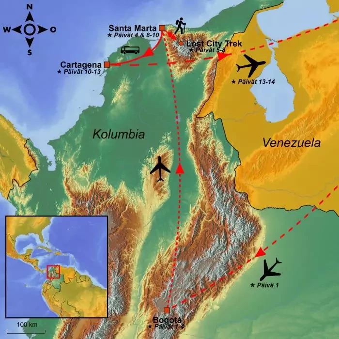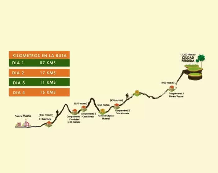 Tänään alkaa vaellus Lost Cityyn. Herätä sisäinen Indiana Jonesisi, sillä tämä seikkailu on kuin pieni tutkimusmatka Sierra Nevadan vuorten vehreään viidakkoon. Noin 50 km pitkä vaellus kestää neljä päivää, kulkien maastossa, jossa lämpötila ja kosteus ovat korkeita. Yöpyminen tapahtuu matkan varrella olevissa yksinkertaisissa leireissä. Taitava oppaasi johdattaa ryhmäsi vaikuttaville Ciudad Perdidaksen raunioille, joista käytetään myös nimeä Lost CIty. Vaikka vaellus on haastava, vakuutamme, että se on täysin vaivansa arvoinen ja saattaa muodostua yhdeksi ikimuistoisimmista kokemuksistasi Kolumbian matkaltasi.