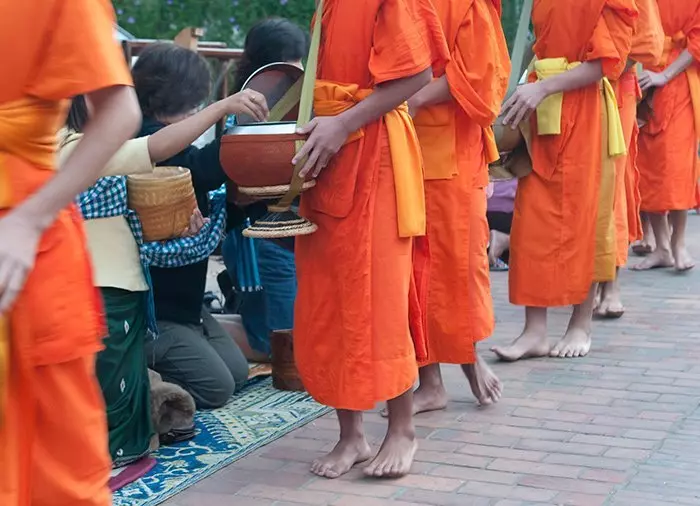 Varhain aamulla temppelien kellojen soidessa pääset todistamaan aivan erityistä tapahtumaa Luang Prabangissa. Yli 300 munkkia kulkee joka aamu täydellisessä hiljaisuudessa kaupungin kaduilla keräten paikallisilta lahjoituksia. Munkit kantavat erityisiä pronssikulhoja, joihin almut laitetaan esimerkiksi riisin ja muiden elintarvikkeiden muodossa. Perinteen mukaan munkit pyytävät ruokaa osoittaakseen nöyryytensä. Almujen kerääminen on buddhalaisuudessa merkittävä uskonnollinen rituaali, ja niin paikalliset kuin turistitkin suhtautuvat siihen kunnioituksella. Jos haluat osallistua almujen antamiseen, oppaasi voi näyttää sinulle, miten se tehdään oikein.
