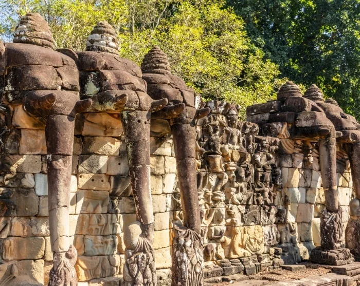Tutustu myös Elefanttiterassiin, jossa pitkä rivi veistettyjä norsunpäitä muodostaa muurin. Täältä kuningas Jayavarman tarkasteli aikoinaan omaa armeijaansa. Lähettyviltä löytyy Spitaalisten kuninkaiden terassi, jolla seisoo hindulaisen mytologian kuolemanjumala Yaman patsas.