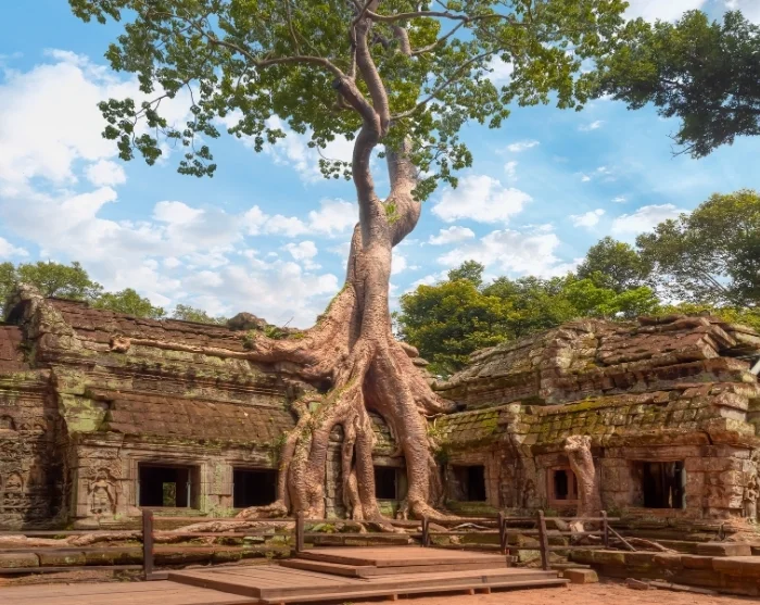 Lyhyen ajomatkan päässä sinua odottaa Ta Prohm, joka eroaa selvästi muista temppeleistä. Valtavat puut ovat juurtuneet keskelle raunioita, ja luonto sekä kivi ovat kasvaneet yhteen kiehtovaksi kokonaisuudeksi.