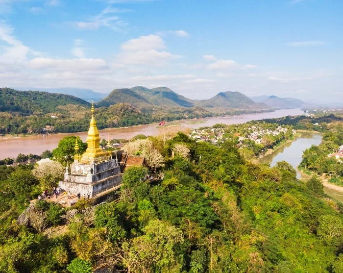 Matka jatkuu Phousi-vuorelle, joka sijaitsee vain kilometrin päässä. Edessäsi on 328 askelmaa, jotka johdattavat koko matkan ylös huipulle. Matkan varrella ohitat pieniä temppeleitä ja Buddha-patsaita, joiden kohdalla voit levähtää ja ihailla maisemia. Huipulta avautuu upea panoraamanäkymä Luang Prabangin kaupunkiin, joille, temppeleihin ja vehreään luontoon – kaikkea tätä kehystävät upeat vuoret, jotka tekevät näkymästä todella vaikuttavan.
