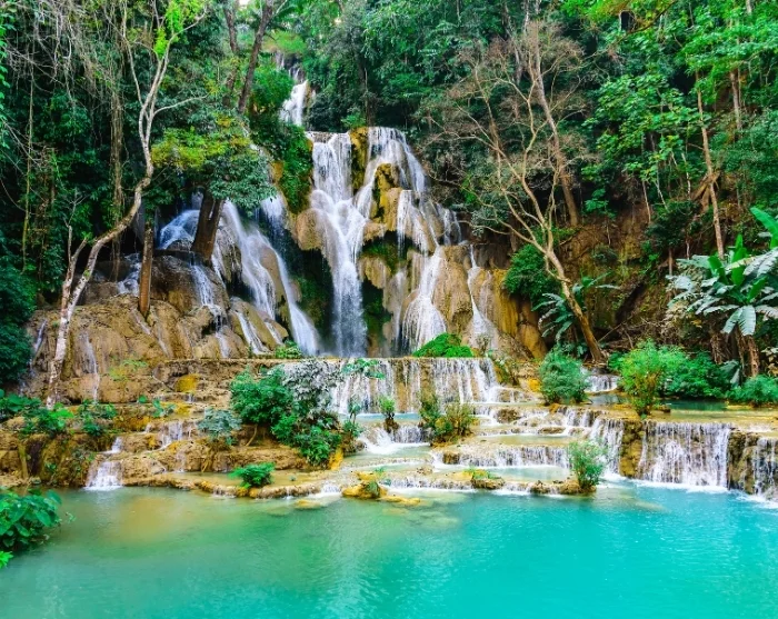 Maukaan lounaan jälkeen suunnataan 30 kilometriä etelään kuuluisalle Kuang Si -vesiputoukselle. Trooppisen viidakon keskellä vesi virtaa kolmessa eri tasossa jyrkkää rinnettä alas. Korkein putous on jopa 60 metriä ja alemmilla tasoilla pääset pulahtamaan kirkkaansiniseen raikkaaseen veteen.