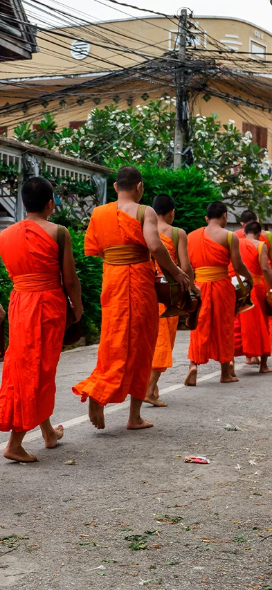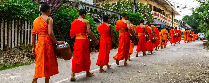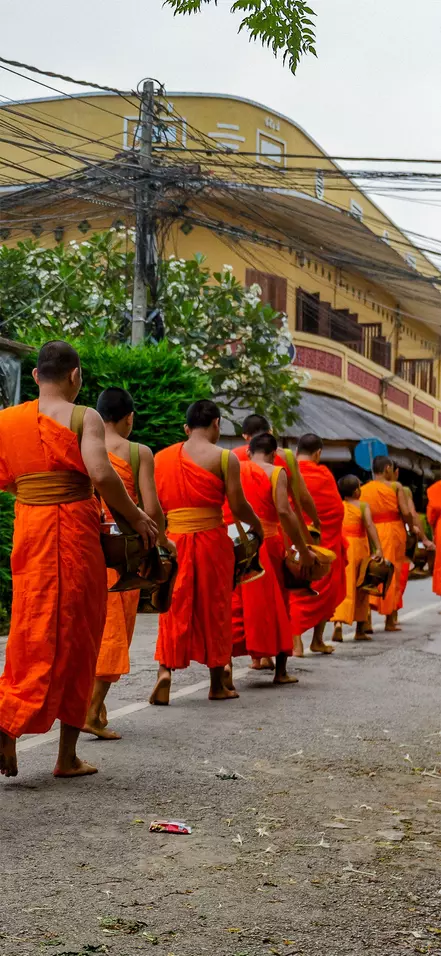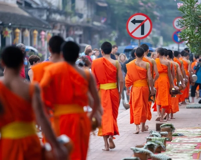 Joka aamu varhaisina tuntein Luang Prabangin kaduilla voi todistaa erityistä tapahtumaa. Sadat munkit kulkevat hiljaisina katuja pitkin keräämässä almuja. Jokainen perhe lähettää yhden perheenjäsenen tuomaan ruokaa tai juotavaa, jotka annetaan munkkien kulhoihin. On vaikea olla vaikuttumatta tästä päivittäisen rituaalin kunnioittavasta hiljaisuudesta ja arvokkuudesta.